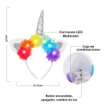 A diferencia de una diadema común, este accesorio cuenta con un diseño llamativo que integra un cuerno colorido en el centro, acompañado de flores de colores. Pero lo que realmente la distingue es que incorpora luces LED internas que cambian de color, creando destellos que hacen que cualquier evento se vuelva inolvidable.