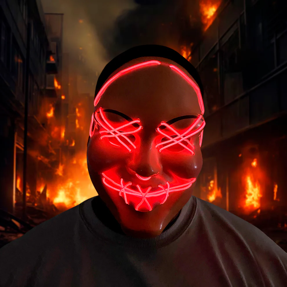 El diseño de la máscara luminosa está directamente inspirado en la estética de La Purga, una de las sagas cinematográficas más representativas del género de terror moderno. Gracias a las luces LED distribuidas en los contornos del rostro, el resultado es un efecto aterrador que logra destacar incluso en ambientes oscuros.