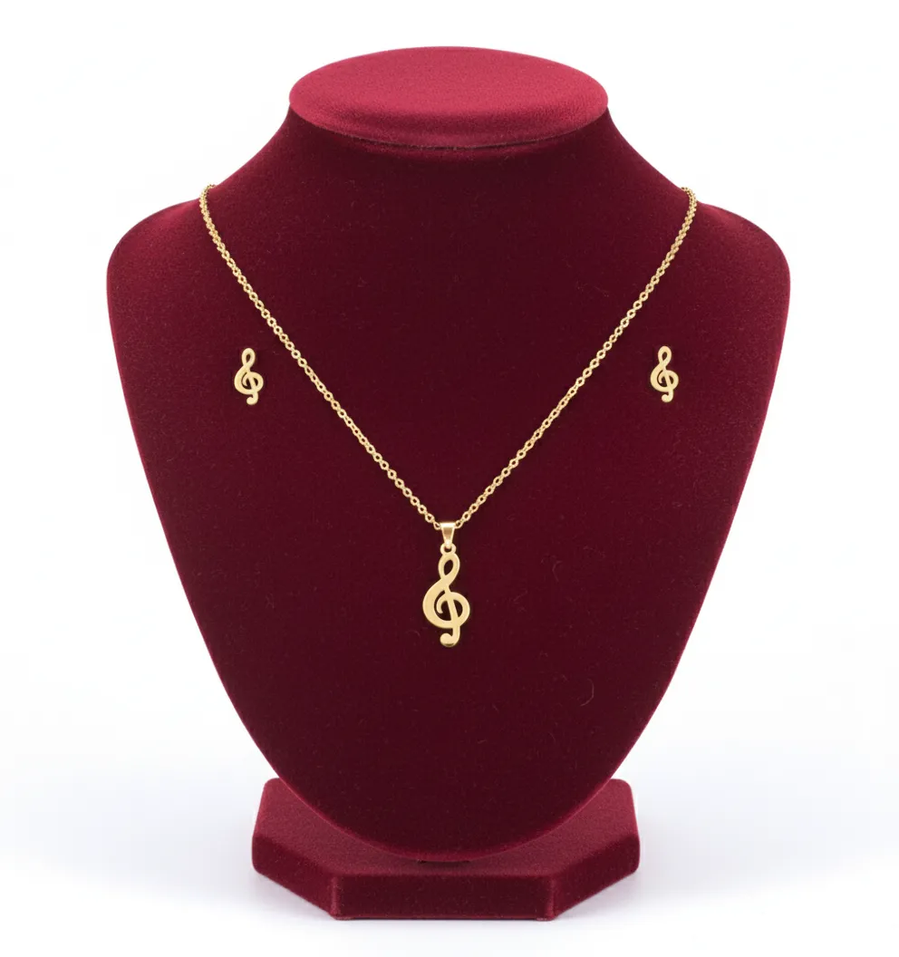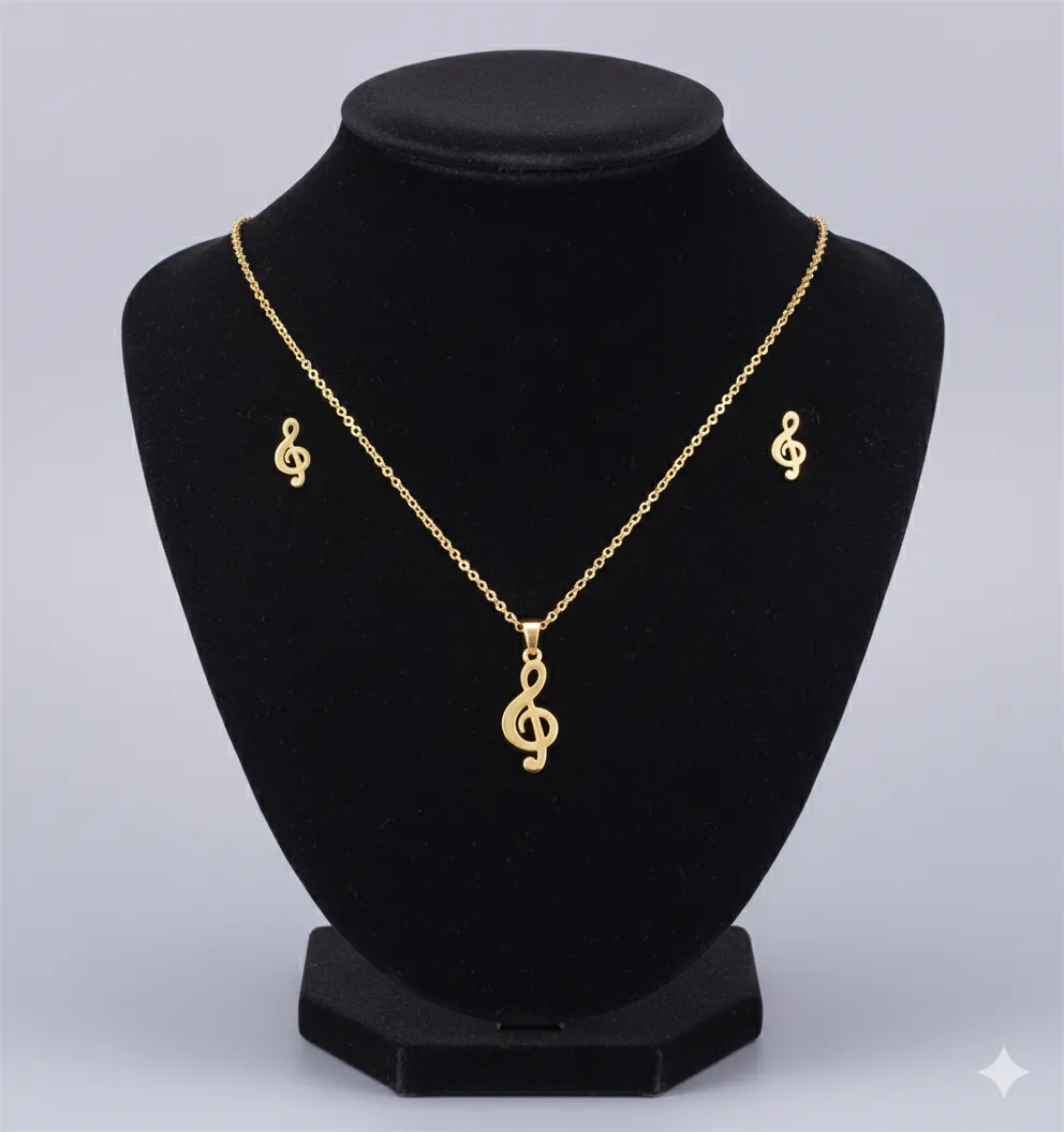En particular, uno de mis favoritos es un set de collar y aretes en acero dorado con diseño de nota musical. Su brillo y sencillez lo hacen ideal para cualquier ocasión: desde una reunión formal hasta un almuerzo casual.