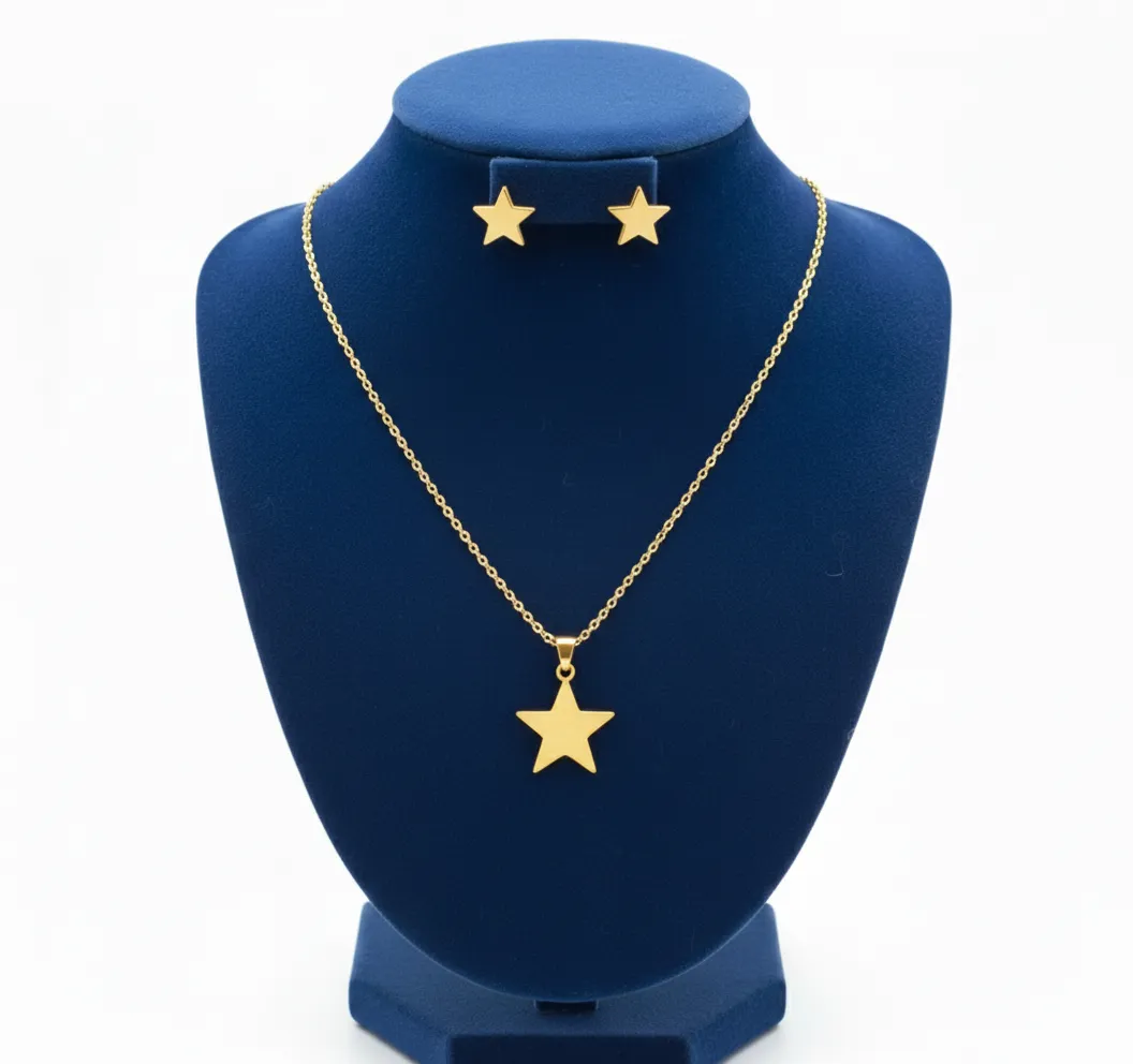 El set de collar y aretes de estrella dorado es, sin duda, una pieza versátil que combina con cualquier outfit y que refleja la belleza en su forma más simple y brillante.