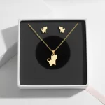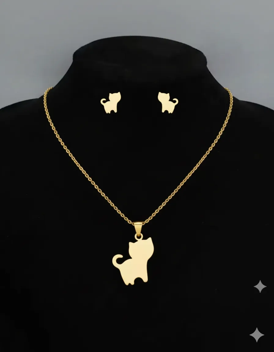 Este es un set de accesorios que cuenta con un collar y un par de topitos en color dorado, con un diseño de gato realmente delicado. Está fabricado en acero inoxidable, un material que destaca por su resistencia y durabilidad, perfecto para quienes queremos piezas que duren y no pierdan su brillo con el tiempo.