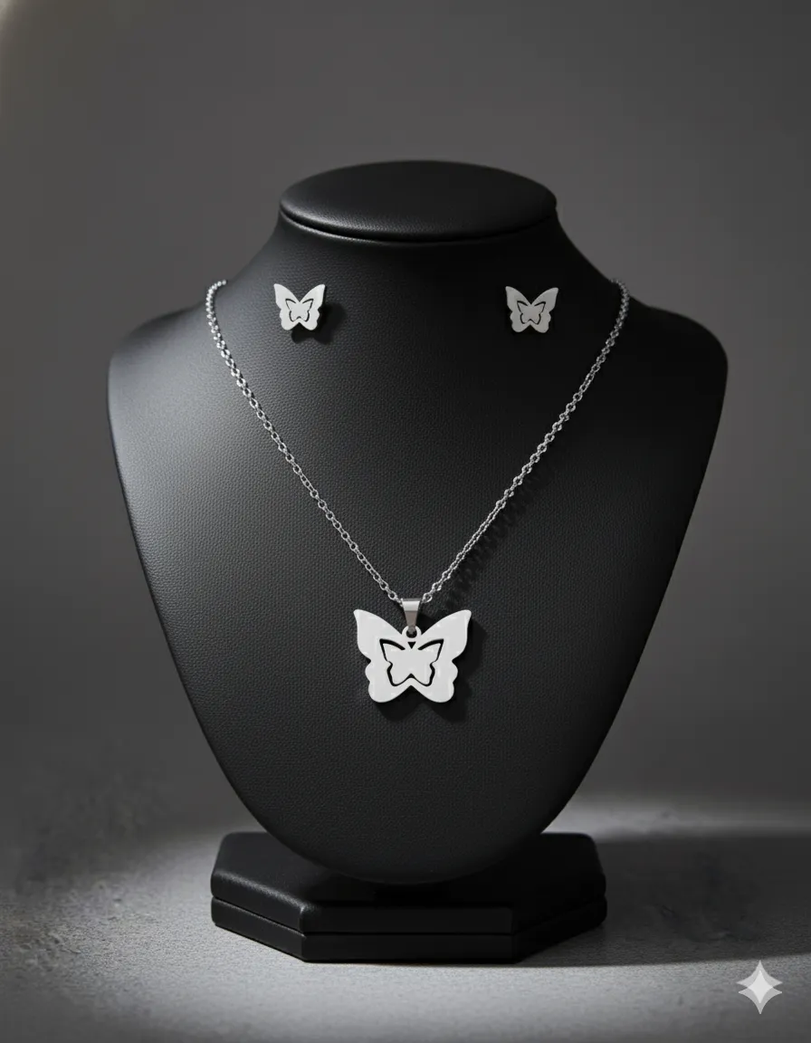 El set de un par de aretes y un collar en forma de mariposa, en colores dorado y plateado, diseñado para todas las edades, desde jóvenes hasta mujeres adultas. Este tipo de joyería en acero inoxidable está elaborada con diseños elegantes que pueden usarse tanto en el día a día como en ocasiones formales, sin perder su brillo ni mancharse con el sudor o la lluvia.