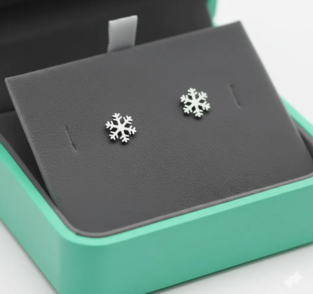 El diseño de los aretes con forma de copo de nieve es un tributo a la elegancia natural. Cada pieza representa la singularidad de los cristales de nieve, con líneas finas y simétricas que resaltan el detalle artesanal.