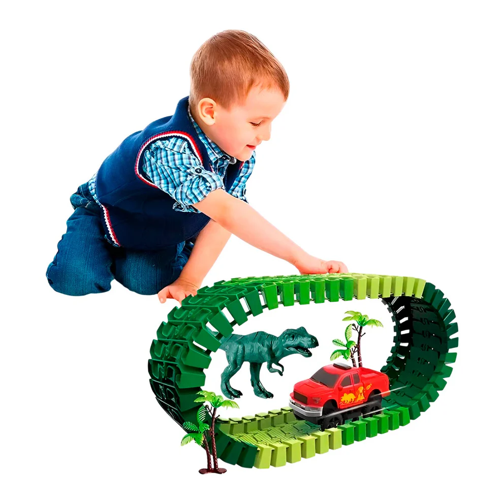Una buena pista armable debe ofrecer calidad, seguridad y versatilidad. El modelo jurásico que utilicé tiene los siguientes detalles: