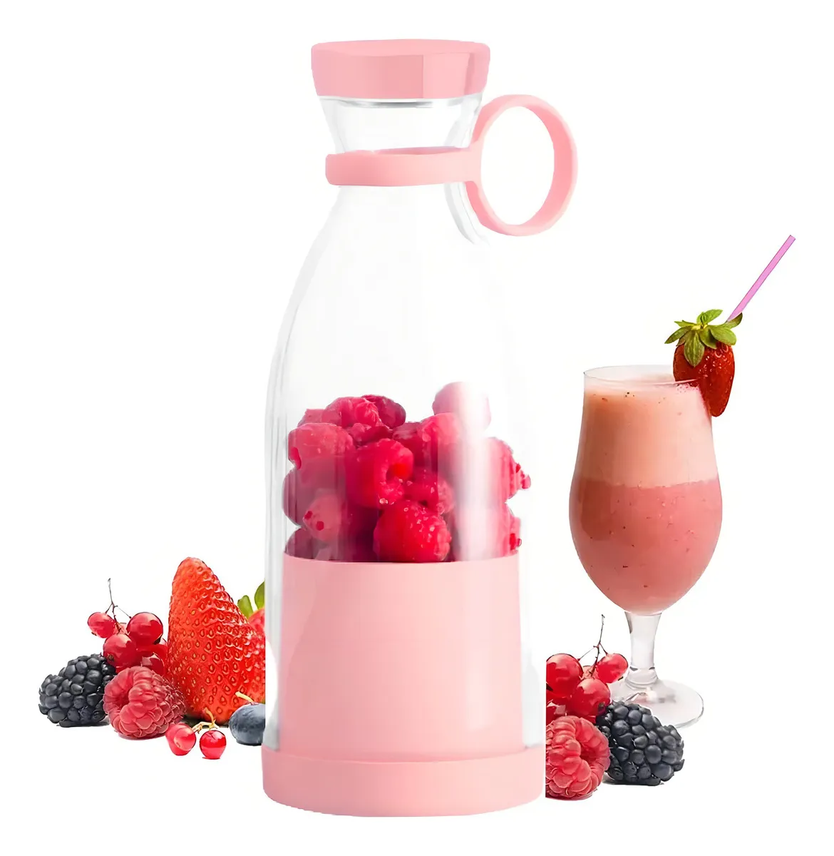 Como licuadora portátil con forma de botella o vaso, diseñada para llevar bebidas y mezclarlas en el momento.