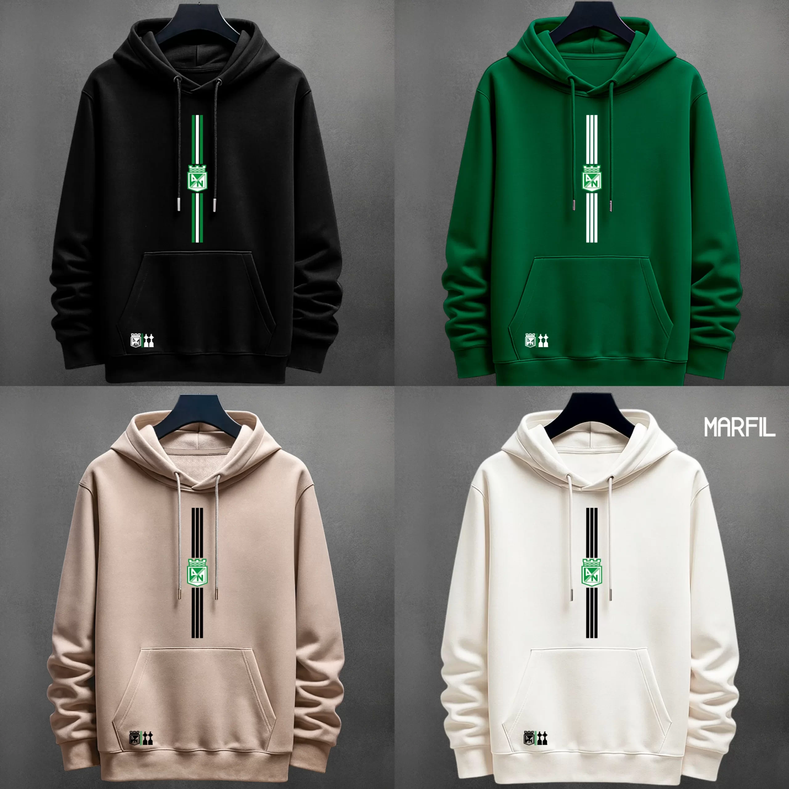Lo que marca la diferencia de estos buzos es que cuentan con un estampado elegante del atletico nacional, cuentan con franjas centradas y el logo del equipo estampado en el centro.